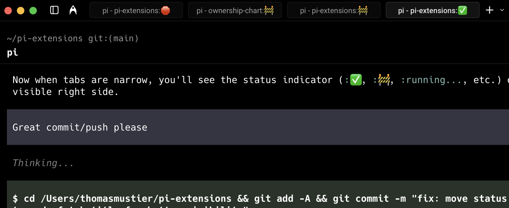 A Pi extension that adds status indicators to terminal tab titles. Manage multiple parallel Pi sessions without forgetting any of them. Currently set up for one session per tab.